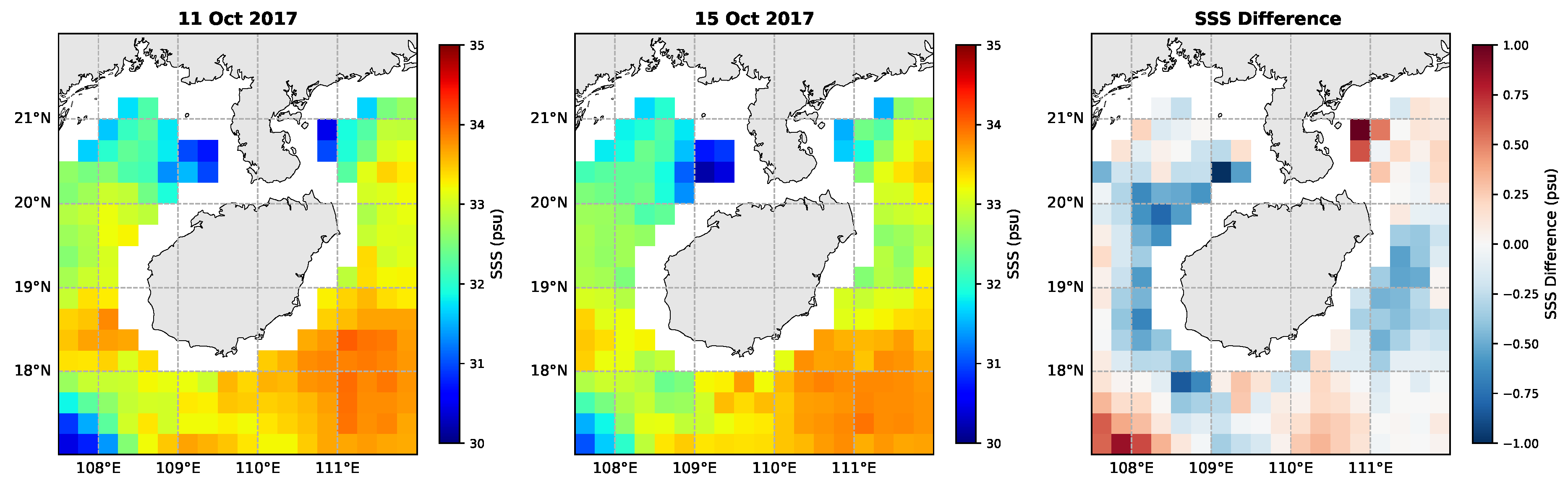 SMAP and ROMS data revealed distinct spatiotemporal SSS variations during Typhoon Khanun, categorized into three phases: pre-typhoon, typhoon, and post-typhoon. Before 11 October (pre-typhoon), SSS in the northern South China Sea was stable, averaging 33 psu, indicative of a uniform autumn oceanic background. During the typhoon (12–16 October), SSS decreased significantly in high-rainfall areas, with the largest reductions observed in nearshore regions, particularly the Beibu Gulf, coinciding with heavy rainfall and landfall on October 16. ROMS simulations, with higher spatial resolution, captured finer-scale SSS reductions in the Beibu Gulf compared to SMAP, highlighting resolution-driven discrepancies. A low-salinity zone emerged in the Beibu Gulf between 14 and 15 October, closely aligned with peak rainfall and high EPV values, which indicated intense wind-driven mixing near the typhoon’s core. Post-typhoon (after 16 October), SSS gradually recovered, though nearshore areas exhibited slower recovery, likely due to regional oceanic dynamics, such as coastal currents, and freshwater retention. The strong winds and low-pressure centers, as evidenced by ERA5 data, amplified upper ocean mixing, contributing to the observed SSS reductions alongside rainfall. These findings suggest that typhoon-induced freshening was most pronounced in coastal regions, modulated by both atmospheric forcing and oceanic processes.