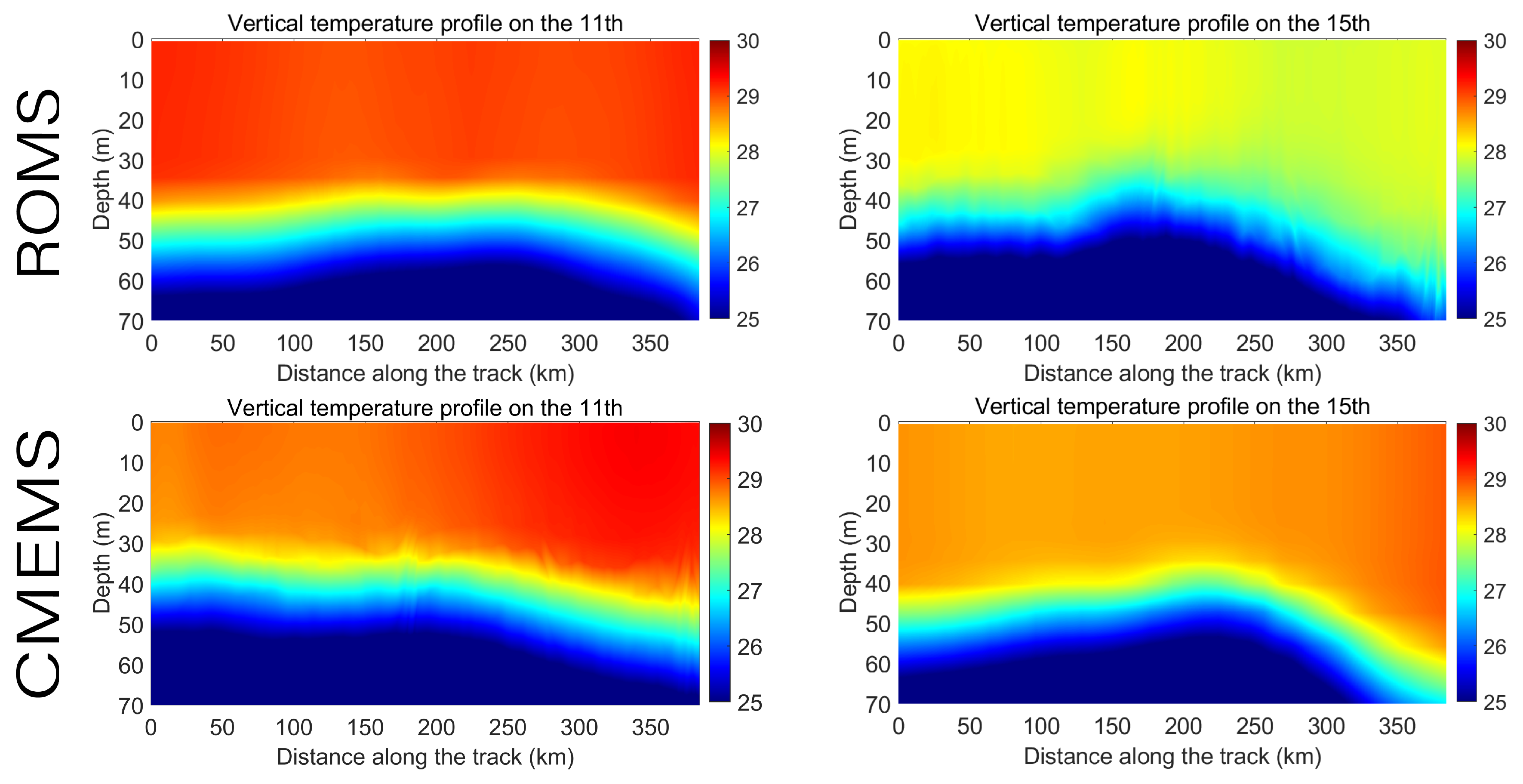 Figure 14); Temperature profiles from ROMS showed substantial subsurface cooling and homogenization of the thermal structure, particularly in upwelling regions on the right side of the storm track, where cyclonic wind stress vorticity was strongest. The strongest cooling peaked 2–7 days post-passage, consistent with observations on 18 October. Upward motions facilitated cold-water upwelling, while downward motions likely represented compensatory flows or near-inertial oscillations, displacing isopycnals and the thermocline. The shallow autumn thermocline in the northern South China Sea amplified cold-water entrainment and freshwater retention, intensifying both cooling and freshening effects.