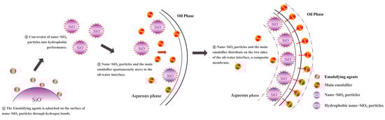 On the other hand, nano-SiO2 can be adsorbed by the auxiliary emulsifier through hydrogen bonding, and its surface is transformed from hydrophilic to hydrophobic. Owing to the difference in hydrophobicity between the anionic component of the primary emulsifier and the modified nano-SiO2, the two naturally distribute on opposite sides of the oil–water interface film, forming a composite membrane resembling a “shell.” When compared to liquid films formed solely by surfactants, higher strength and thickness are exhibited by composite membranes. Furthermore, more nano-SiO2 and main emulsifiers are accumulated at the oil–water interface, which enables the composite membrane to significantly reduce interfacial free energy and further enhance the stability of the emulsion system [31].