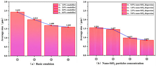 (a) Average particle size distribution of the base emulsion; (b) average particle size distribution of the emulsion at different nano-SiO2 dispersion concentrations.