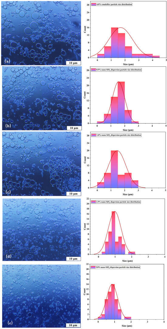 Figure 4a–e show optical microscope images of the base emulsion (4% surfactant) after the addition of different concentrations of nano-SiO2 dispersion. With an increase in the concentration of the nano-SiO2 dispersion, a significant decrease in the droplet size and a narrowing of the size distribution are observed. When the concentration reaches 2.5%, the particle size decreases by 32.9%, and the number of small droplets increases, improving film strength and effectively inhibiting droplet coalescence. When the concentration reaches 5.0%, the film strength is maximized; however, excessive nano-SiO2 leads to enhanced particle-particle interactions, causing flocculation and limiting the further reduction in particle size [35,36].