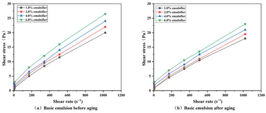 Fitting relationship between shear stress and shear rate of emulsions containing different emulsifiers: (a) before aging, (b) after aging.