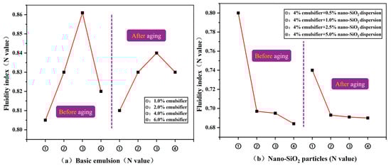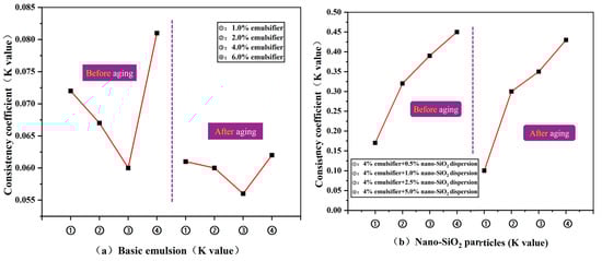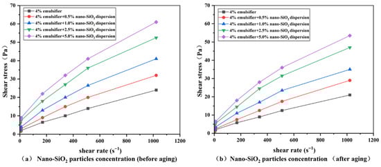 As shown in Figure 6, an increase in shear stress was observed upon adding different concentrations of nano-SiO2 dispersion to the emulsion both before and after aging, and this increase became more significant as the concentration of the nano-SiO2 dispersion increased. Observing Figure 7b, it can be observed that the values before and after aging both show an increasing trend, and the values after aging are significantly lower than those before aging. This indicates that as the concentration of the nano-SiO2 dispersion increases, the viscosity of the system gradually rises, and more particles are adsorbed onto the droplet surface. Due to the interaction between the continuous phases, a network structure forms around the droplets, thereby increasing the viscosity of the emulsion [40,41]. As the temperature increases, the thermal motion of emulsifier molecules is intensified, resulting in a more orderly arrangement of the oil–water interface. This arrangement enhances the binding between emulsifier molecules and nano-SiO2 and improves droplet dispersion. This weakens the network structure formed by nano-SiO2, ultimately resulting in a decrease in system viscosity. Comparing the values in Figure 8a,b, it is observed that the value further decreases after adding nano-SiO2, which can be attributed to the disruption of the network structure under shear stress, causing the emulsion to gradually transition from an expansive fluid to a pseudoplastic fluid. As the concentration increases, when the concentration of the nano-SiO2 dispersion reaches 1.0%, the change in values slows down relatively, indicating that the network structure has basically formed [42,43].