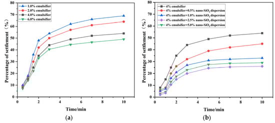Figure 10 demonstrates the effect of different concentrations of nano-SiO2 dispersions on the oil separation rate of the emulsion. As the concentration of nano-SiO2 increases, the upper layer of the emulsion gradually turns white, indicating that more nano-SiO2 binds with the auxiliary emulsifier, altering the wettability and enhancing its dispersion effect in the oil phase. Experimental results show that when the nano-SiO2 concentration is below 1.0%, the oil separation rate exceeds 40%, as the concentration is insufficient to effectively stabilize the oil–water interface, resulting in poor droplet stability. However, when the concentration increases to 2.5% and 5.0%, the oil separation rate is lower within 10 min, at 26% and 29%, respectively. This indicates that the composite film formed by nano-SiO2 and the emulsifier has high mechanical strength. However, excessive nano-SiO2 can form flocculation on the droplet surface, increasing the droplet’s weight and making it more prone to settling, thereby leading to a reduction in the overall stability of the emulsion and increasing the oil separation rate [45,46].