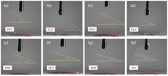 Contact angles of emulsions on glass under different formulations: (a) 1% emulsifier; (b) 2% emulsifier; (c) 4% emulsifier; (d) 6% emulsifier; (e) 4% emulsifier + 0.5% nano-SiO2 dispersion; (f) 4% emulsifier + 1.0% nano-SiO2 dispersion; (g) 4% emulsifier + 2.5% nano-SiO2 dispersion; (h) 4% emulsifier + 5.0% nano-SiO2 dispersion.