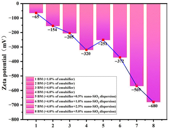 To investigate the adsorption of emulsifiers and nano-SiO2 at the oil–water interface, the changes in zeta potential were monitored and are presented in Figure 11. All measured zeta potentials were below −60 mV, indicating good emulsion stability. When the emulsifier concentration increased from 1.0% to 6.0%, the absolute value of the zeta potential showed a gradual increase, reaching 65 mV, 154 mV, 205 mV, and 320 mV, respectively, with growth rates of 136.9%, 33.1%, and 56.1%. This suggests that more negatively charged emulsifier molecules adsorb at the interface, thereby enhancing electrostatic repulsion between droplets and the improvement of stability. When the concentration approaches 4.0%, adsorption sites tend to saturate, and the growth rate of electrostatic repulsion slows down. When the emulsifier is in excess, negatively charged micelles form, further increasing the charge density of the dispersed phase, leading to a slight increase in the growth rate of the zeta potential [49].