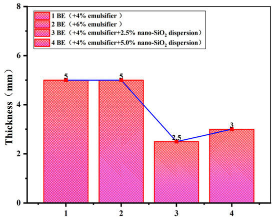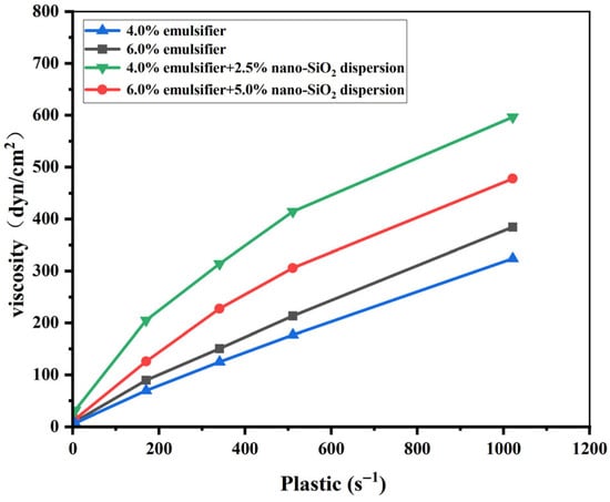 As can be seen from Equation (6), nano-SiO2 carries a negative charge in the emulsion. In an alkaline environment, it interacts with the anionic component of the negatively charged primary emulsifier through electrostatic repulsion, accelerating its diffusion to the surface of water droplets. This promotes the uniform distribution of water droplets, reduces droplet aggregation and coalescence, thus enhancing the stability of the emulsion [30].