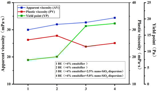 When comparing Formulations 2, 3, and 4, the addition of 2.5% nano-SiO2 dispersion significantly increased AV. This is because nano-SiO2 particles form a network structure around droplets, enhancing the system’s viscosity and stability. Meanwhile, PV decreased by 14.3%, attributable to nano-SiO2 strengthening electrostatic repulsion between droplets and acting as a lubricant to reduce frictional resistance. The increase in YP is due to the network structure enhancing gel strength, thereby improving the system’s ability to resist deformation under external forces. However, when the addition of nano-SiO2 dispersion reaches 5.0%, excessive nano-SiO2 reacts with solid particles through flocculation, causing AV to continue rising but at a slower rate. PV increases because flocculation disrupts the electrostatic balance of the system, resulting in larger floc particles and increased friction within the system; YP also further increases, indicating enhanced gel structural strength. However, the system’s fluidity significantly decreases. In actual drilling operations, even though the increased YP enhances rock-carrying capacity, insufficient fluidity can impair drilling efficiency, thereby weakening the positive effects of high strength [54,55].