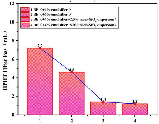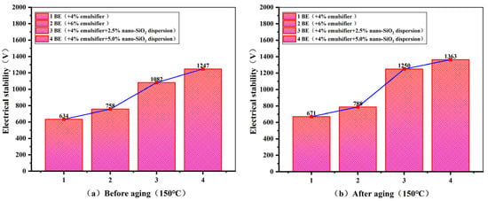 The addition of different doses of nano-SiO2 dispersion and emulsifier resulted in varying degrees of change in the electrical stability of the offshore drilling fluid, as shown in Figure 14a. The demulsification voltage increased gradually from Formulation 1 to Formulation 4, with a maximum increase of 96.7%. The increase from Formulation 1 to 2 was 19.6%, and from Formulation 1 to 3, it was 70.7%. This indicates that both the emulsifier and nano-SiO2 can improve the system’s electrical stability. In formulation 2, a 6% emulsifier concentration led to the formation of micelles, whose negative surface charge interacted with the negative charge on the droplet surface, further enhancing the electrostatic repulsive force and thereby increasing the demulsification voltage. In formulation 3, nano-SiO2 and emulsifier co-adsorb on the droplet surface, reinforcing the oil–water interface membrane and significantly improving the system’s electrical stability. However, in formulation 4, although the demulsification voltage continues to increase, the growth rate slows down, indicating that excessive nano-SiO2 leads to increased viscosity and flocculation, thereby reducing the system’s stability [56,57].