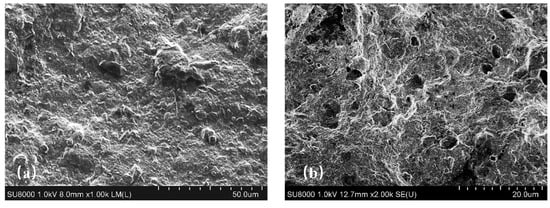 Figure 17 shows the mud cake morphology of Formulation 1 and Formulation 3. It was found that the mud cake with only 4% emulsifier added (Figure 17a) had a rough and irregular surface, with numerous pores and irregular protrusions and depressions of varying sizes. However, after adding 2.5% nano-SiO2 dispersion, as shown in Figure 17b, the mud cake surface becomes smoother, featuring smaller pores and a more compact structure. This indicates that an appropriate amount of nano-SiO2, owing to its small particle size, can penetrate the mud cake, seal the small pores, and render the structure of the mud cake denser and more uniform. Consequently, the fluid loss under high-temperature and high-pressure conditions is reduced [61,62].