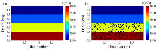 A comparative interpolation analysis employing the curvelet interpolation method and stepwise interpolation approach is conducted on a layered velocity model (Figure 1a). The model dimensions are 800 m × 1910 m with a grid spacing of 10 m. A total of 192 receivers are deployed at 10 m intervals. Under idealized noise-source distribution conditions (Figure 1b), 300 ambient noise sources are randomly distributed within the subsurface zone spanning a depth of 400–800 m and lateral extent of 0–1910 m. Key acquisition parameters include source wavelet frequency band: 0–30 Hz, sampling interval: 0.001 s, recording duration: 300 s, and data incompleteness: 50% random traces missing.