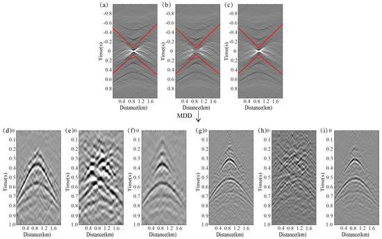 Cross-correlation reconstructed records and MDD results (convolved with a 10/15 Hz Ricker wavelet). The two red-line demarcated regions correspond to PSF, while areas outside represent correlation functions. (a) Cross-correlation reconstruction under fully sampled seismic traces, (b) cross-correlation reconstruction with 50% seismic traces missing, processed via curvelet interpolation, (c) cross-correlation reconstruction with 50% seismic traces missing, processed via stepwise interpolation, (d–f) the result of MDD of (a–c) convolved with a 10 Hz Ricker wavelet, (g–i) the result of MDD of (a–c) convolved with a 15 Hz Ricker wavelet.