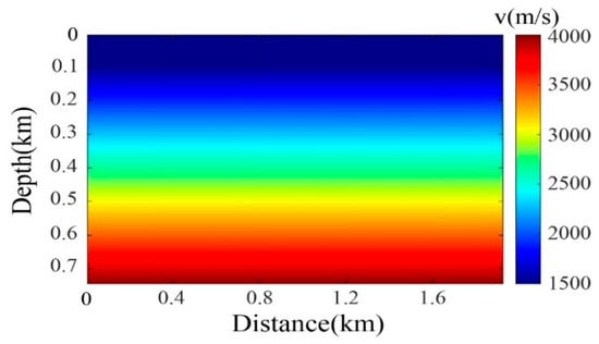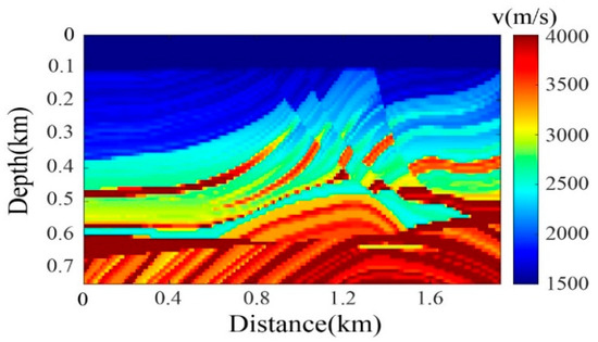 Experiments were conducted on the marine Marmousi model (Figure 4), with model dimensions of 830 m × 1910 m (including a 100 m water layer) and a grid spacing of 10 m. Receivers were deployed at 10 m intervals, totaling 192 receivers. To address receiver sparsity challenges in wavefield reconstruction, common-shot domain to common-receiver domain transformations were implemented, and curvelet-transform interpolation and stepwise interpolation methodologies were employed to regularize irregularly sampled data.