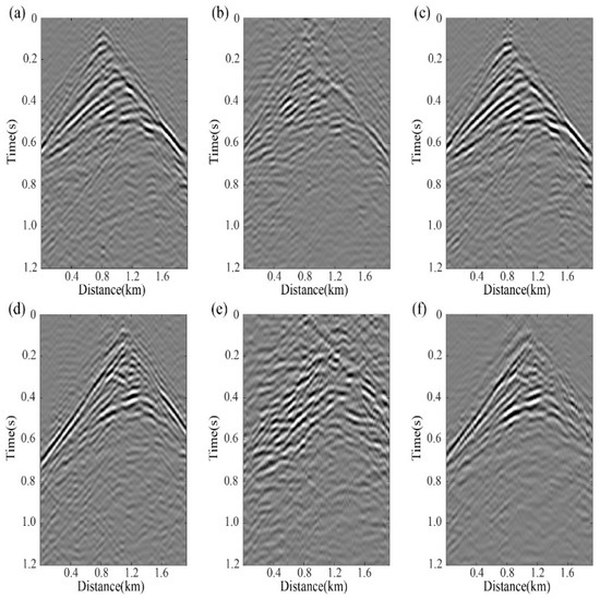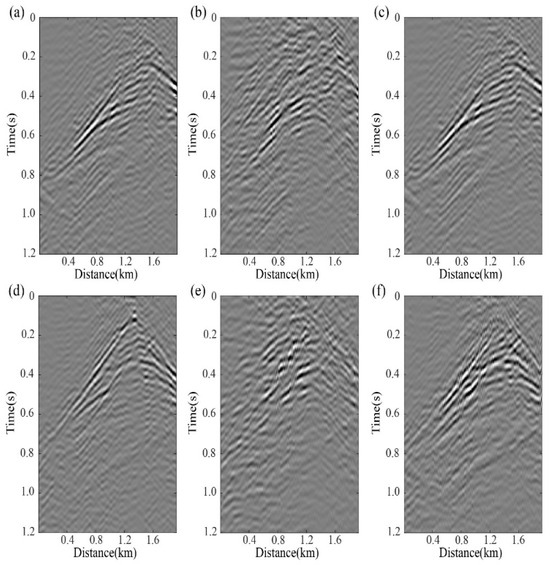 Comparative analysis of Figure 14a,b,d and Figure 14e reveals significant limitations in the pure curvelet-transform-based interpolation method under low missing trace conditions (20%). The reconstruction accuracy markedly deteriorates, failing to adequately recover phase and amplitude characteristics of seismic signals. When missing traces increase to 50%, the SNR of reconstructed records plummets, with effective reflections being obscured by noise and rendered nearly unrecognizable. However, as demonstrated by Figure 14a,c,d,f, the RMDD strategy maintains high-fidelity seismic signal recovery even under high trace-depletion scenarios (50%). The interpolated records exhibit strong consistency with MDD results from complete datasets in three key aspects—waveform coherence, event continuity of seismic phases, and energy distribution patterns. This validates the robust adaptability of RMDD method to non-uniform source distributions.