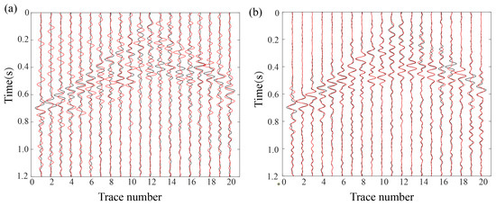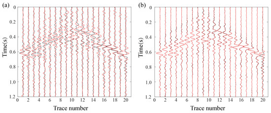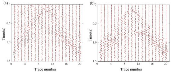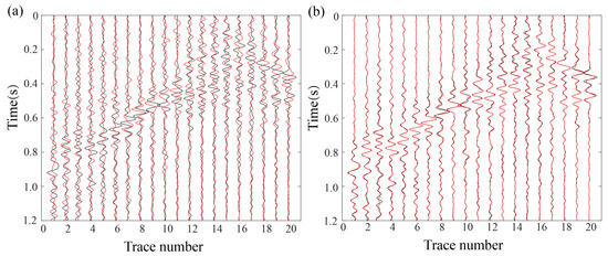 A total of 20% randomly missing traces. Black traces represent MDD reconstruction results from intact data (Figure 7d). (a) Red traces correspond to MDD results using Curvelet transform interpolation (Figure 7e). Trace comparison between Figure 7d,e. (b) Red traces denote RMDD results (Figure 7f). Trace comparison between Figure 7d,f.