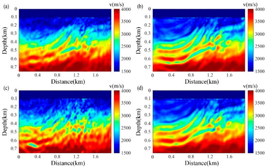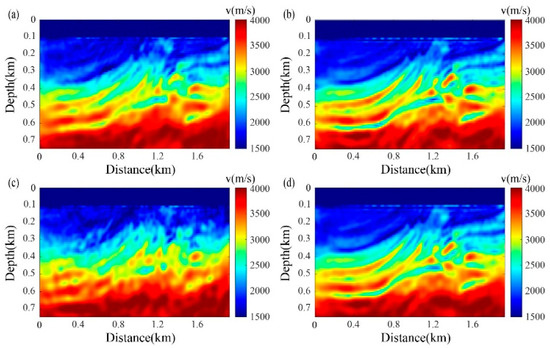 PSFWI results under non-ideal random noise-source distribution. (a) PSFWI results using pure curvelet-interpolated PVS records with 20% randomly missing seismic traces, (b) PSFWI results using RMDD PVS records with 20% randomly missing seismic traces, (c) PSFWI results using pure curvelet-interpolated PVS records with 50% randomly missing seismic traces, (d) PSFWI results using RMDD PVS records with 50% randomly missing seismic traces.