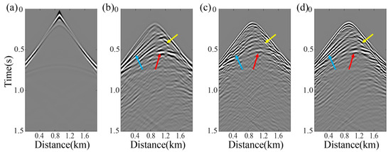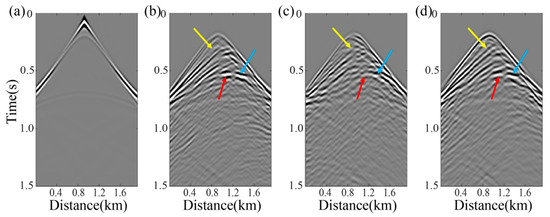 Three different colors indicate three distinct differences across different images. Quality check of the objective function with 50% randomly missing seismic traces. (a) Observed records derived from the initial model in Figure 6, (b) active-source reference result, (c) synthetic active-source data reconstructed from PSFWI results using curvelet-interpolated records, (d) synthetic active-source data reconstructed from PSFWI results using RMDD records.