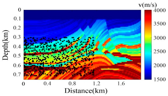 Non-uniform source distribution leads to degraded reconstruction accuracy of seismic records, as incomplete effective information increases interpolation complexity. Therefore, under non-ideal noise-source distribution conditions, it becomes imperative to validate the applicability of the proposed methodology. Noise sources were randomly positioned within the subsurface zone spanning a depth of 300–700 m and lateral extent of 0–1150 m (Figure 13). Passive sources cover only 60% of the lateral spatial range. The configuration included 800 ambient noise sources, source wavelet frequency band: 0–30 Hz, sampling interval: 0.001 s, and acquisition duration: 900 s. Two data incompleteness scenarios were simulated: 20% random traces missing and 50% random traces missing.
