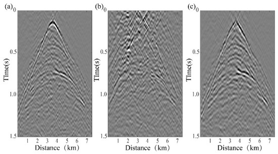 Figure 20a displays the MDD reconstruction result using complete seismic trace records. Figure 20b presents the MDD reconstruction with only curvelet transform-based interpolation under 50% random missing traces, while Figure 20c shows the RMDD result under identical data-loss conditions. Comparative analysis of Figure 20a–c demonstrates that the RMDD reconstruction achieves significantly higher accuracy than the curvelet-only approach, particularly in recovering the majority of reflection signals with enhanced fidelity. The RMDD methodology effectively preserves critical kinematic and dynamic characteristics of subsurface reflectors. This advantage becomes more pronounced in the trace-to-trace comparison between Figure 21a,b, where the RMDD exhibits superior phase consistency and amplitude preservation compared to conventional curvelet interpolation.