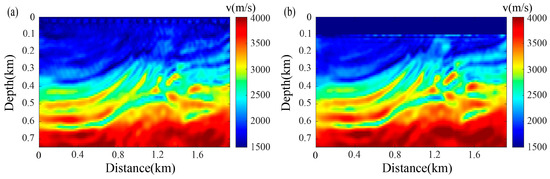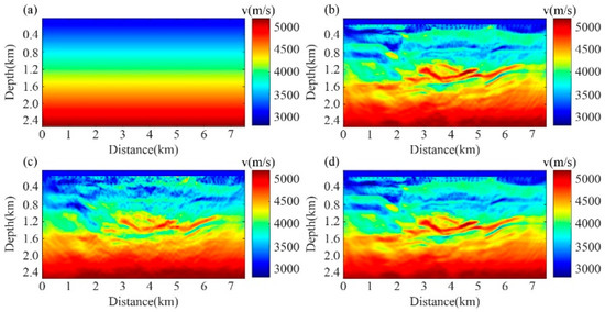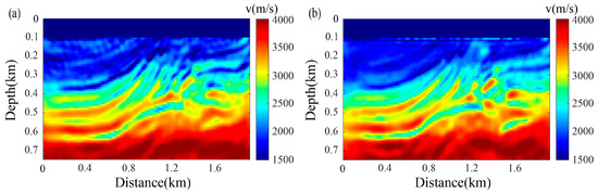 In Equation (18), the normalization of NCPSFWI is consistent with the active-source normalized correlation FWI. Both involve normalization of the amplitude. Regarding the choice of NCPSFWI over correlation PSFWI, this can be seen from the results in Figure 23. The inversion in Figure 23b is clearly of higher quality. This demonstrates the superior effectiveness of NCPSFWI.