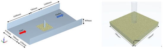 Since the sediment particle size in the CFD-DEM coupling model simulations is significantly larger than that in the experimental tests, it is necessary to proportionally increase the inlet flow velocity in the numerical model to maintain consistency in the dimensionless Shields number between simulations and experiments. The dimensionless Shields number is defined as the ratio of the Shields number θ to the critical Shields number θcr, expressed by Equations (1) and (2) as follows: