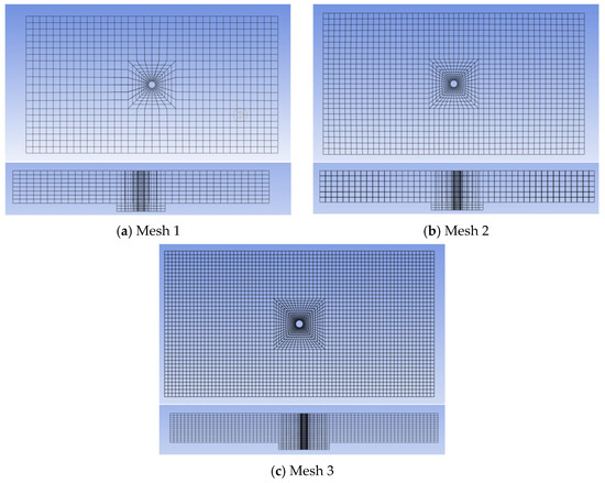 To validate the CFD-DEM coupling model, a numerical model was developed based on experimental data from monopile scouring tests under unidirectional flow [36]. The experiment was conducted in a 60 m × 4 m × 2.5 m flume with a 4 m × 4 m × 0.35 m sand box in the middle. The d50 of the sand sample is 0.29 mm. The relative density of the sand is 2.67, the viscosity of the water v is 10−6 m2/s, and the water depth is 0.4 m. The model includes a fluid domain, a sediment seabed, and a circular monopile foundation. By simultaneously accounting for the coupled interactions between fluid dynamics and granular mechanics, the model accurately simulates the scouring process around the monopile foundation, thereby validating its reliability in capturing complex fluid-sediment-structure interactions, as shown in Figure 1. The model uses three different densities of CFD mesh division to conduct a grid size sensitivity analysis which is shown in Figure 2.