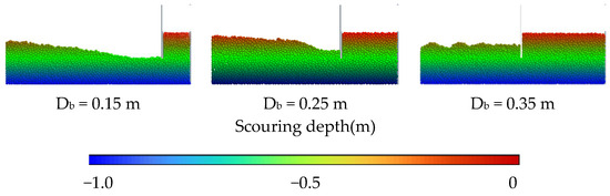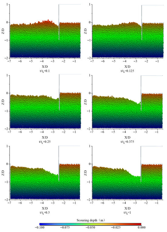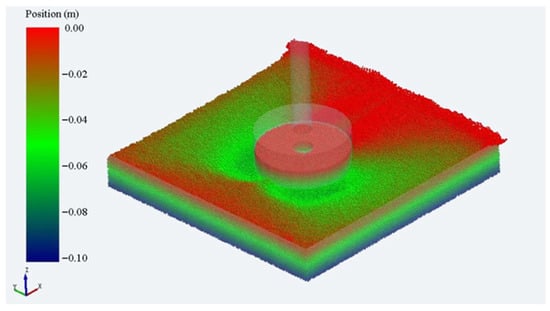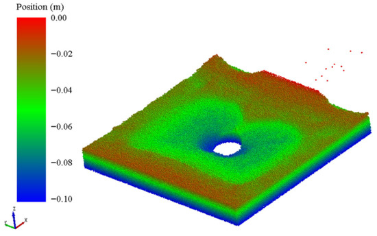 Through multiple simulation comparisons, the inlet flow velocity in the model was set to 1.6 m/s to replicate real-world scouring conditions. Figure 3 illustrates the three-dimensional view of the scour pit at the equilibrium stage of the scouring process. The flow direction aligns with the x-axis, and the particle colors are color-coded by scouring depth. A symmetrical and uniform scour pit forms around the monopile, with the maximum scouring depth (approximately 85 mm) occurring at ±45° upstream of the monopile. This result matches the equilibrium scouring depth values reported in experimental studies from the literature, validating the model’s accuracy.