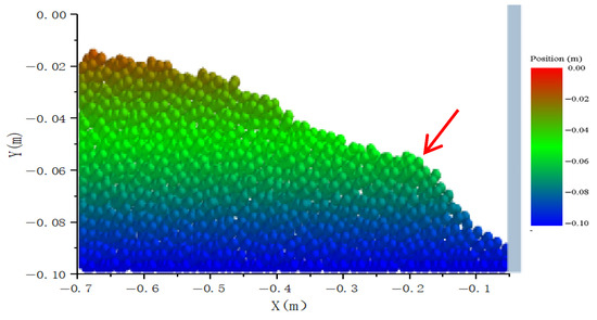 In Fluent, a transient simulation was conducted using the finite volume method for flow field discretization. The pressure–velocity coupling was resolved via the SIMPLE algorithm with a first-order upwind scheme. The fluid domain boundaries were configured as follows: a velocity inlet with an average flow velocity of 1.6 m/s, applied normal to the inlet boundary and with a turbulence intensity of 5%, and a pressure outlet set to atmospheric pressure. The side and top boundaries were defined as symmetry planes, while the remaining surfaces were treated as no-slip walls. The standard k–ε model was adopted for turbulence modeling, and the Gidaspow drag model was selected for inter-phase momentum exchange. To ensure numerical stability and facilitate data exchange between the simulations, the time step in Fluent was set to an integer multiple of that in EDEM. Accordingly, the Fluent time step was specified as 100 times that of EDEM, i.e., 5 × 10−3 s. The total number of time steps was 10,000, corresponding to a physical time of 50 s. To satisfy the convergence criterion requiring absolute residuals below 10−3, the maximum number of iterations per time step was set to 500. The parameters used in the CFD model are listed in Table 2.