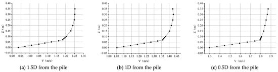The inflection point where the scour slope begins to decrease serves as the reference for determining the maximum scour pit radius. This inflection point is approximately located at coordinates x = −0.08 m, y = 0.08 m, as illustrated in Figure 4. Three measurement points were evenly selected between the inflection point and the monopile foundation to measure flow velocities. Figure 5 shows the variation in flow velocity with water depth at these measurement points. The velocity profiles follow a logarithmic distribution with depth, consistent with experimentally measured velocity distributions reported in the literature. Here, Z denotes the vertical distance from the measurement point to the sediment bed surface.