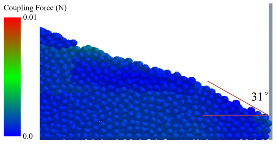 Interactions between sediment particles serve as the primary driving factor for local scour phenomena. The friction and momentum transfer among particles directly influence the movement trajectories and states of soil particles around the pile, thereby governing the extent and depth of scour pit development. The Hertz–Mindlin no-slip model was employed to simulate inter-particle collisions. Within this model, the coefficient of restitution—a key parameter reflecting the efficiency of kinetic energy transfer during collisions—was set to 0.45 based on experimental results from Wang et al. [37]. To account for inter-particle friction, the static friction coefficient was determined according to the friction angle of the sediment, with its tangent value equal to the natural angle of repose of the sand, which is 33°. Given the low rolling friction in underwater conditions, the rolling friction coefficient was set to 0.01. Additionally, the particle density and Poisson’s ratio were specified as 2670 kg/m3 and 0.35, respectively. Since particle stiffness has a relatively minor influence on the local scour process, the shear modulus was defaulted to 5 MPa. To improve computational efficiency and address the impact of particle size and quantity on the simulation speed of the DEM model, the particle diameter was set to 5 mm. The simulation time step was set to 5 × 10−5 s, and to accurately track particle motion, the data saving interval was defined as 0.05 s. The specific parameters of the DEM model are summarized in Table 1.