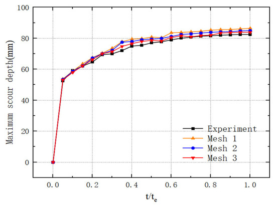 Figure 7 depicts the time history of local scouring around the monopile with different mesh sizes. The vertical axis represents the maximum scouring depth, calculated by extracting the minimum seabed elevation (Z-coordinate) of sediment particles. The horizontal axis denotes the scouring time, normalized by the equilibrium scour time te. It can be seen that as the mesh density increases, the improvement in computational accuracy is limited, with the error in the development process of scouring depth being within 3%. However, the time required for computation increases significantly, which seriously affects the timeliness of the project. Therefore, the mesh division for the subsequent MGB foundation adopts the same mesh density as Mesh 1 in the verification simulation.
