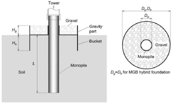 Numerical simulation studies have addressed scour prediction, risk assessment, foundation response, and microscopic mechanisms. Risk assessment methodologies integrating probabilistic scour hazard and structural fragility were developed for suction bucket and pentapod foundations [20]. Numerical models revealed that scour protection has minimal impact on monopile natural frequency but significantly reduces pile head rotation under SLS [21]. Parametric finite element analyses quantified the “stiffening effect” of rock armor scour protection [22,23]. Scour was shown to non-linearly reduce the bearing capacity of wide-shallow foundations [24] and composite bucket foundations [25], and to increase stress and reduce fatigue life in tripods component [26]. For seismic conditions, scour significantly alters monopile bearing responses [27]. The CFD-DEM (Computational Fluid Dynamics—Discrete Element Method) coupling method emerged as a powerful tool for simulating local scour mechanisms [28,29]. This method was also effectively applied to study scour around twin piles [30] and to evaluate innovative protection nets [31]. Studies also modeled complex foundations under nonlinear waves [32]. Research on scour effects for monopile-oriented hybrid foundations has been conducted [33,34,35]. However, unlike previously studied monopile-bucket hybrids which often feature a deep suction bucket, or friction-wheel-bucket hybrids that rely primarily on surface friction, the MGB foundation integrates a shallow bucket with a gravel-filled gravity wheel. This configuration places a significant mass and a wide, shallow skirt at the mudline, fundamentally altering the flow-structure-seabed interaction mechanism compared to other hybrids. Consequently, the scour development patterns and their subsequent impact on the soil-structure interaction, a critical aspect for its bearing capacity, remain unexplored and form the unique contribution of this paper.