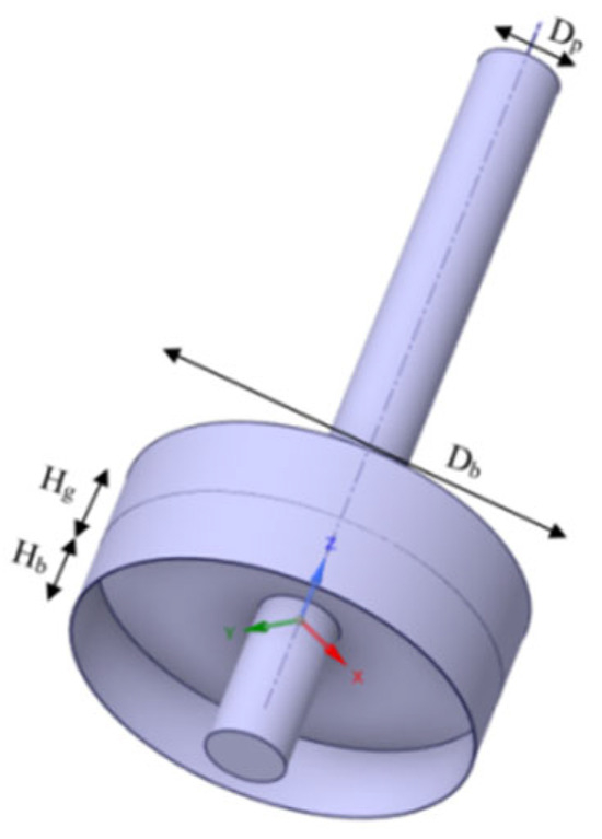 The MGB hybrid foundation comprises three components: a monopile, a gravel-filled gravity wheel, and a suction bucket. The gravity wheel and suction bucket share an identical outer diameter, with their base structures integrated into a single composite unit that combines the gravity wheel’s base and the suction bucket’s top cover. The monopile is installed through a central guide hole in the composite unit, which mechanically restricts horizontal displacement while allowing vertical motion. During construction, gravel filling within the gravity wheel generates sustained vertical loads, significantly enhancing overall stability. Figure 8 illustrates the structural configuration, with key parameters including: monopile diameter D, suction bucket diameter Db (equals to gravity wheel diameter Df), bucket height Hb, gravity wheel height Hg, wall thickness t. Figure 9 shows the three-dimensional geometry of the hybrid foundation model and it’s main parameters.