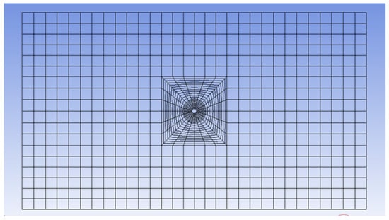 This study investigates scouring mechanisms around the MGB hybrid foundation. The gravel-filled gravity wheel was simplified as a solid boundary using geometric similarity criteria to isolate structural morphology effects. A hexahedral-dominant structured mesh combined local refinement in scouring zones, prism layers for near-wall accuracy, and gradient-adaptive transitions between regions. Minimum cell size (>5 mm) ensured grid independence and minimized numerical dissipation in sediment-particle simulations. The top view of the mesh can be seen in Figure 10.