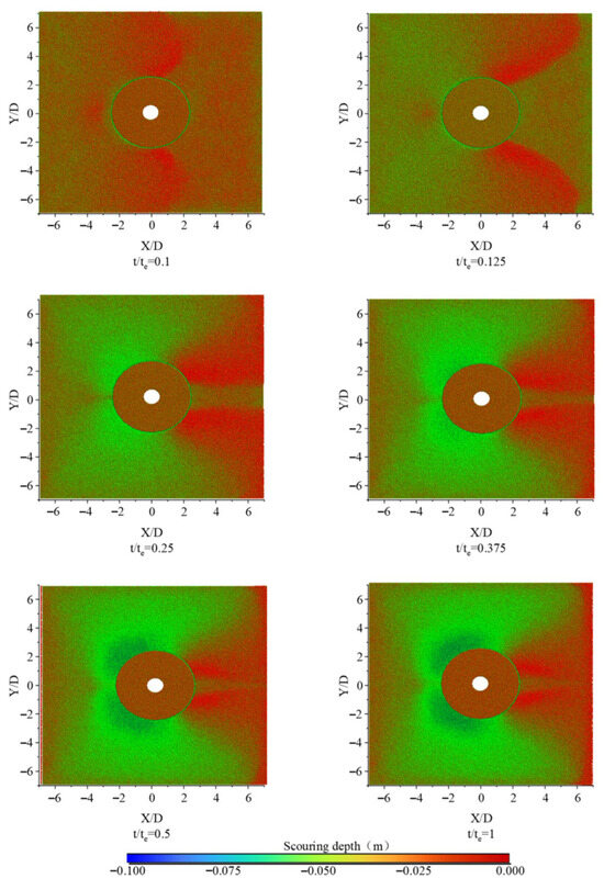 Figure 12 illustrates the normalized spatiotemporal evolution of the scour pit, divided into three phases: (1) Initial phase: rapid vertical scour initiates near the monopile’s upstream and lateral zones, transporting sediment downstream to form deposition mounds; (2) Transition phase: scour rates decelerate, and lateral expansion perpendicular to the flow becomes prominent, intensifying near-bed shear stresses close to the structure; (3) Stable phase: the scour pit stabilizes spatially, with downstream deposition migrating farther and the height of the sediment zone decreasing.