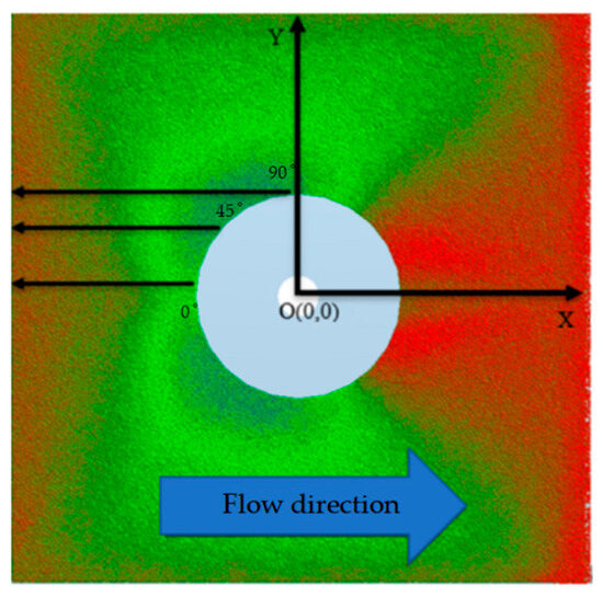 To determine the maximum scouring depth around the MGB hybrid foundation and investigate localized scouring at different positions, three critical positions were selected for analysis: 0° (directly upstream), 45° (lateral), and 90° (side) relative to the flow direction, all centered at the foundation’s cross-sectional axis and adjacent to the bucket component. The positions selected can be seen in Figure 14.
