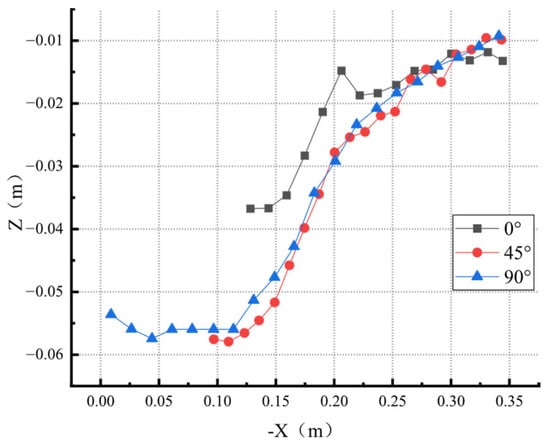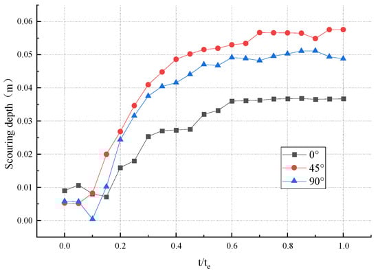 The temporal evolution of maximum scouring depths at these locations was presented in Figure 15. Throughout the scouring process, the 45° position consistently exhibited the greatest scouring depth, surpassing both the 0° and 90° positions. During the initial phase, scouring depths at 0° and 45° increased linearly at comparable rates, while the 90° position lagged significantly. As scouring progressed, the upstream (0°) scour rate decelerated, resulting in a stabilized depth hierarchy at equilibrium: 45° > 90° > 0°. Figure 16 details the scour pit profiles at the three angles. The horizontal axis represents the distance from the foundation center, and the profiles exhibit S-shaped curves. The 45° and 90° directions share similar maximum scouring depths (approximately −0.058 m), exceeding the 0° direction (−0.037 m). Notably, the 45° scour pit spans the largest spatial extent, with a maximum radius of 0.22 m, confirming it as the most scoured region. These findings validate the selection of the 45° cross-section for subsequent studies, providing a reliable basis for further analysis of scouring mechanisms.