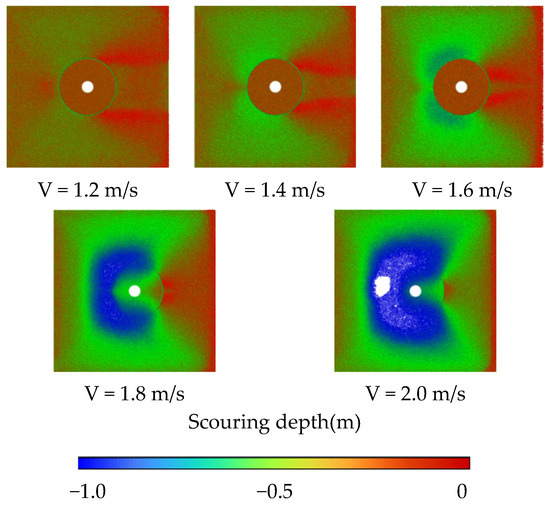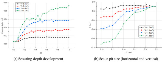 Figure 23a demonstrates that across four flow velocities (1.2–1.8 m/s), the maximum scour depth increases nonlinearly with velocity—rising from 0.017 m at 1.2 m/s to 0.090 m at 1.8 m/s. Scour development follows a distinct rapid growth, deceleration, and equilibrium sequence: at higher velocities of 1.6–1.8 m/s, rapid initial growth transitions to minor subsequent increases, whereas lower velocities of 1.2–1.4 m/s achieve stabilization earlier. Figure 23b reveals consistent scour pit morphology across all velocities as a ‘gentle slope–flat bottom’ profile. This general morphology is consistent with observations from scour around other large-diameter structures, where the wide foundation base limits the downflow and horseshoe vortex strength, leading to a wider and shallower scour pit with a flatter base compared to standard monopiles. The specific dimensions of this morphology, however, are uniquely influenced by the MGB’s geometric parameters such as bucket diameter and height. Increasing velocity substantially amplifies both scour depth and spatial extent: maximum depth progresses from approximately 0.015 m with a boundary near X = 0.15 m at 1.2 m/s, to 0.035 m at 1.4 m/s, 0.06 m at 1.6 m/s, and 0.095 m at 1.8 m/s. These results confirm that flow velocity dictates quantitative scour parameters—depth and extent—while fundamental morphological characteristics remain invariant across velocities, reflecting scouring’s intrinsic physical mechanisms.