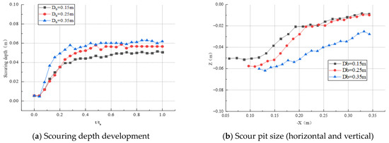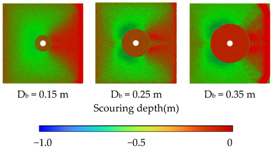 The equilibrium state scour pits under three bucket diameters (0.15 m, 0.25 m, and 0.35 m) were shown in Figure 19. As the bucket diameter increases, the scour pit expands spatially, transitioning from a “horseshoe-shaped” morphology to a more symmetrical and regular pattern, with limited erosion downstream of the bucket and minimal scouring in the wake zone. Figure 20 displays the longitudinal scour profiles upstream of the bucket foundation for these diameters. When the bucket diameter increases from 0.15 m to 0.35 m, the scouring depth increases, and the upstream boundary of the scour pit extends outward, reflecting a morphological evolution influenced by the bucket geometry.