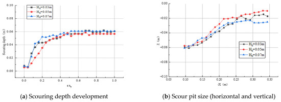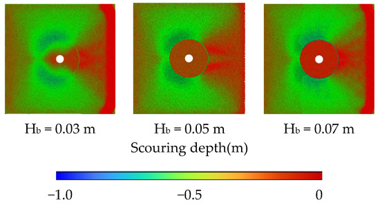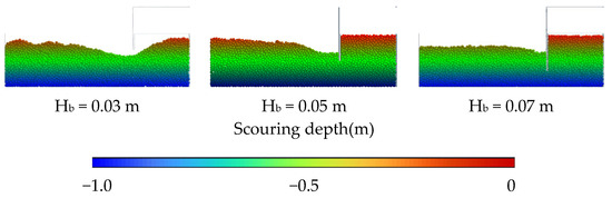 Figure 21 displays the equilibrium state scour pits under three bucket heights (Hb = 0.03 m, 0.05 m, and 0.07 m). At Hb = 0.03 m, significant scouring occurs around the bucket foundation, with erosion observed upstream, laterally, and beneath the structure, leading to under-base hollowing that threatens stability—consistent with flow field analysis results. As the bucket height increases to Hb = 0.07 m, the scour extent slightly expands compared to Hb = 0.05 m. Figure 22 further validates these findings through upstream longitudinal profiles: severe under-base erosion is evident at Hb = 0.03 m, while increasing the bucket height reduces localized erosion but significantly enlarges the scour extent.