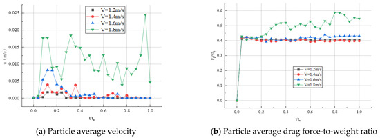 Figure 26a quantifies average particle velocity within the maximum scour zone across four flow velocities (1.2–1.8 m/s). Higher velocities generate proportionally greater particle speeds, peaking at 0.002 m/s at 1.2 m/s, 0.004 m/s at 1.4 m/s, 0.008 m/s at 1.6 m/s, and 0.024 m/s at 1.8 m/s. Lower velocities of 1.2–1.4 m/s concentrate particle activity predominantly in the early stage (t/te < 0.4), whereas 1.8 m/s induces sustained high-velocity motion with pronounced fluctuations.