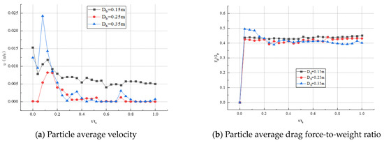 Comparison of particle average velocity development and average drag force at different bucket diameters.