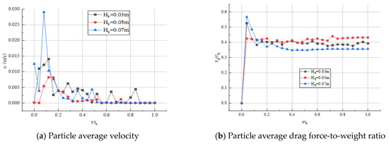 Comparison of particle average velocity development and average drag force at different bucket heights.