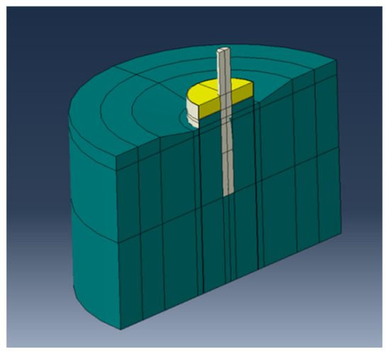 The MGB hybrid foundation is modeled as steel with an elastic modulus E = 2.1 × 105 Mpa, Poisson’s ratio ν = 0.3, and density ρ = 7850 kg/m3. The steel is idealized as an elastic-perfectly plastic material. The gravel-filled zone adopts the Mohr-Coulomb elastoplastic model with an elastic modulus E = 200 Mpa, internal friction angle φ = 38°, cohesion c = 8 kPa, dilation angle ψ = 8°, and density ρ = 1850 kg/m3. The surrounding soil mass is also modeled using the Mohr-Coulomb elastoplastic model with parameters: elastic modulus E = 40 Mpa, internal friction angle ν = 0.3, cohesion c = 3 kPa, dilation angle ψ = 5°, and density ρ = 2650 kg/m3. The interface between the MGB hybrid foundation and soil is simulated using the penalty method for tangential contact (friction coefficient 0.3) and the hard contact model for normal contact.