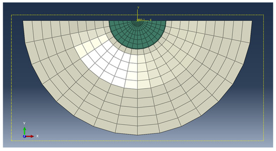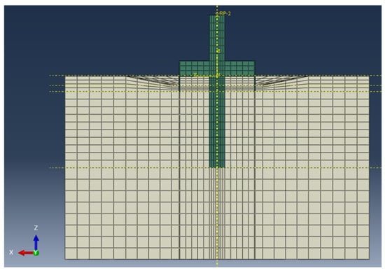 The model employed the following boundary conditions: full vertical constraint at the base, lateral restraint along side boundaries, and suppressed normal displacement at the symmetry plane. Following initial geostatic stress equilibration and removal of scoured soil material, a horizontal displacement load was applied along the negative X-axis through a reference point rigidly coupled to the monopile top. The hybrid foundation mesh utilized structured C3D8R hexahedral elements with three critical refinements: (1) enhanced resolution at high-stress zones, (2) radial-circumferential patterning around the bucket periphery, and (3) graded soil discretization featuring fine elements near the foundation transitioning to coarser elements distally. All elements satisfied strict quality criteria including dihedral angles exceeding 15°, aspect ratios below 10, and distortion values under 0.85 to ensure analysis precision. The front and top view of the mesh are shown in Figure 31 and Figure 32.