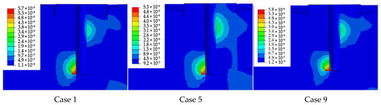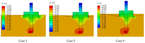 Figure 33 shows that as the scouring depth increases, the soil displacement zone around the MGB hybrid foundation expands, and bending deformation at the monopile base intensifies. However, the horizontal displacement at the monopile base remains similar, attributed to the monopile’s global stiffness, deep soil support, and displacement-controlled loading. Under the same scouring depth, the spatial extent of soil deformation increases with scour range, though less significantly than scouring depth effects.