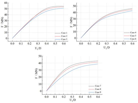 Figure 36 displays the displacement-load curves for different simulation cases. The horizontal axis represents the dimensionless displacement ratio U1/D, and the vertical axis represents the horizontal bearing capacity F. All curves initially follow a linear trend (elastic stage), then transition into an elastoplastic stage with gradual curvature, and finally stabilize, indicating proximity to the ultimate bearing state.