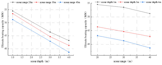 Figure 37 demonstrates the effects of scouring parameters on ultimate bearing capacity. Increased scouring depth and scour range both reduce capacity, with scouring depth exhibiting a more pronounced impact. When scouring depth increases from 1 m to 4 m, ultimate bearing capacity decreases by approximately 20–25%: at a 20-m scour range, capacity drops 21.8% from 55 MN to 43 MN; at 30 m, it decreases 22.6% from 53 MN to 41 MN; and at 40 m, it declines 23.5% from 51 MN to 39 MN. Expanding the scour range from 20 m to 40 m reduces capacity by 5–10%: at a 1-m scouring depth, capacity decreases 7.3% from 55 MN to 51 MN; at 3 m, it falls 6.5% from 46 MN to 43 MN; and at 4 m, it reduces 9.3% from 43 MN to 39 MN.