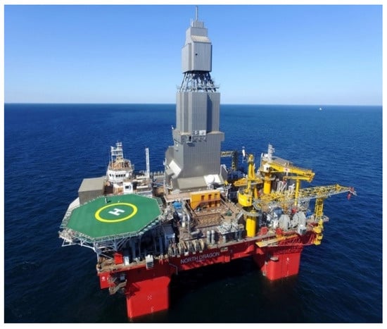 With the global economic boom driving steady growth in oil consumption, countries are increasingly turning to deep-sea oil development. As key offshore operation facilities for drilling and oil extraction, the number of semi-submersible platforms is rising alongside the offshore oil demand, leading to a higher risk of ship collisions [1,2]. Such collisions generate massive impact forces, causing severe structural damage to these large-scale facilities. Moreover, the harsh working environment of semi-submersible platforms makes component repair more difficult and costly. Thus, improving the platform’s anti-collision capacity during the design stage has become a crucial research focus. China’s “North Dragon” semi-submersible drilling platform, designed to meet Norwegian Maritime Directorate and offshore industry standards, operates in the North Sea and Barents Sea with a maximum water depth of 1200 m, maximum drilling depth of 8000 m, and service temperature of −25 °C. It can withstand once-in-a-century storms, features an advanced automated drilling system (boosting efficiency by 15% via parallel automatic pipe arranging), and is uniquely capable of Arctic operations—making structural optimization to enhance its anti-collision and working performance practically significant. Figure 1 displays the “North Dragon” semi-submersible drilling platform.