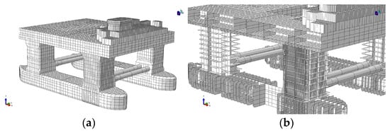 The finite element model of the semi-submersible platform: (a) the semi-submersible platform model; (b) the internal support structure of the column and the floating pontoon.